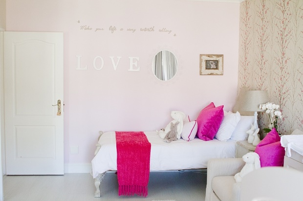 ¡Buenos días! Ya terminamos semana, y no quería que te perdieras esta preciosa habitación para una bebe que estará como una reina. Rebosante de dulzura, cálida y acogedora, perfecta para que se vaya adaptado a todas las etapas porque lleva una cuna a un lado y otro una camita para cuando vaya creciendo, y eso si todo en su dormitorio tanto de bebe como para cuando vayan pasando unos años. Con un mobiliario de aires afrancesados por las molduras de la mesilla y las patas de la cama y a la vez mezclado con un estilo más actual gracias a la estética de la cómoda y la cuna. De color un decapé para no hacer destacar mucho los muebles de la estancia porque el papel pintado de la pared, que sirve de cabecero tanto como para la cama y la cuna, tiene mucha personalidad ya que no es el típico papel que se utiliza en los espacio para bebes si no que es de aire más juvenil, sin embargo hace una preciosa combinación tanto para la cuna como para la cama.