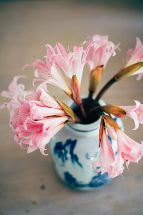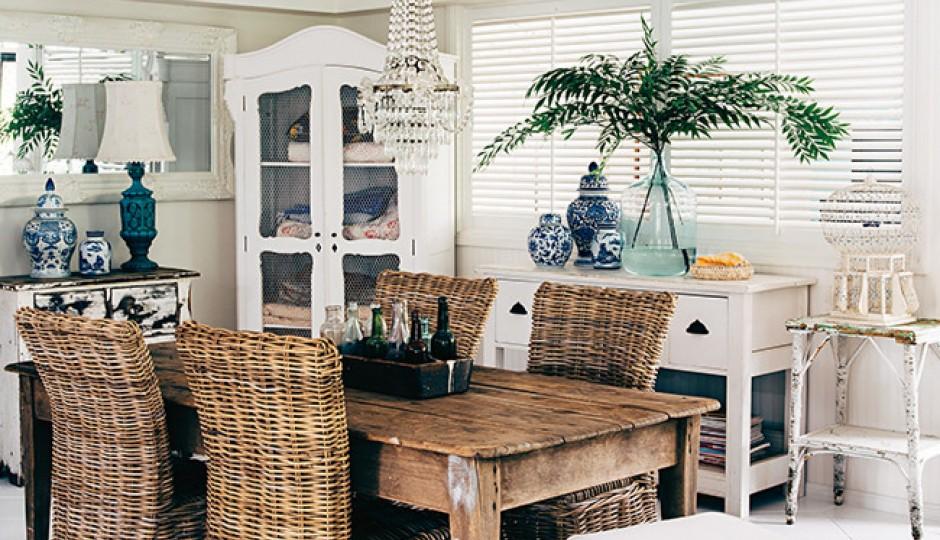 En el comedor una mesa rústica sin tratar y sillas de fibra rescatadas de una tienda de segunda mano por la dueña de la casa son el eje central. Otros muebles recuperados con sus pátinas originales en tono blanco y piezas de porcelana en tonos azules y blancos coviven en una perfecta armonía.
