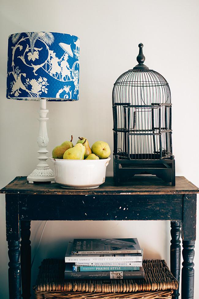 En este pequeño rincón se nos ofrece una suerte de bodegón que mezcla una mesa antigua con la huella del tiempo escrita de una hermosa forma a través de roces y deasgastes. Completado en conjunto con una lámpara que ha sido renovada con una nueva pantalla de motivos orientales hecha por la dueña de la casa.Sobre la mesa encontramos también una original jaula comprada en una subasta.