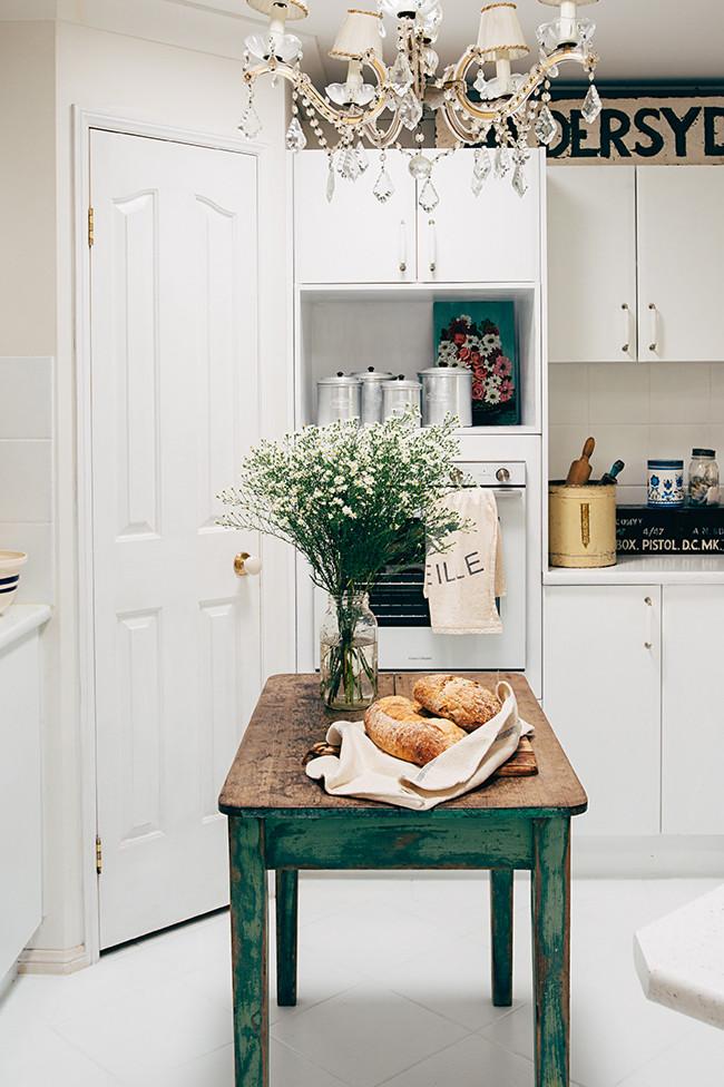 La cocina fue repintada por su dueña en un blanco total .El punto de color la pone la mesa central a modo de isla y presidida por una lámpara de cristal.Convirtiéndose estas dos piezas en verdaderas protagonistas de espacio.Esa mezcla de rústico y clásico siempre me ha parecido un acierto¿Tú que opinas?.