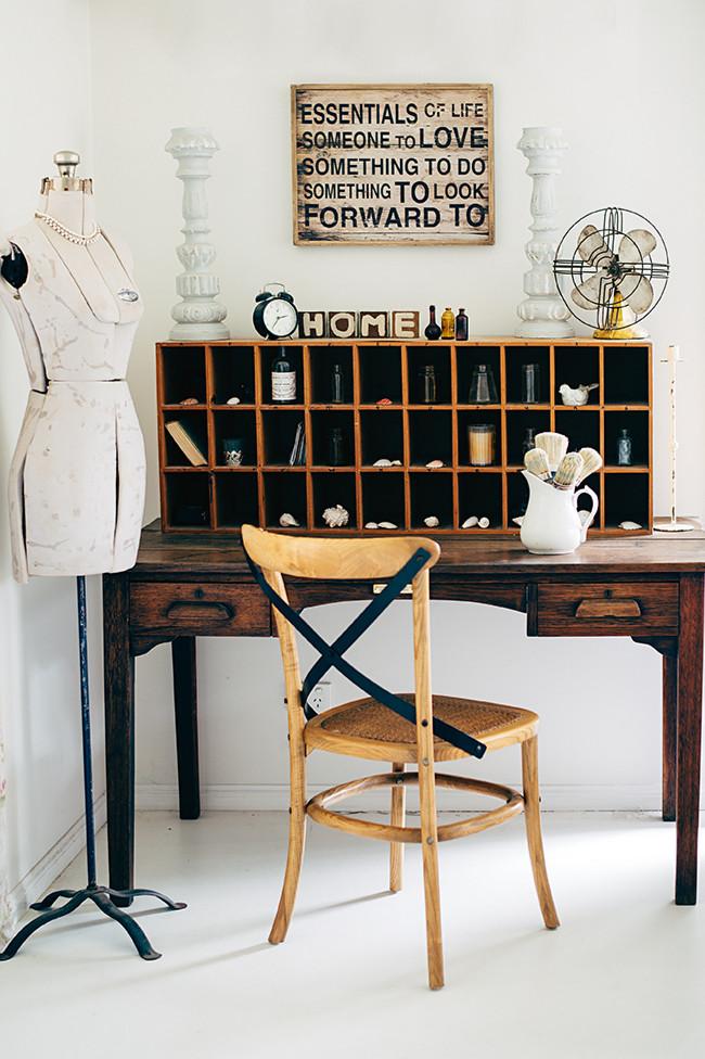 La zona de trabajo con este escritorio también vintage y el casillero encima. Me lo pido!!!