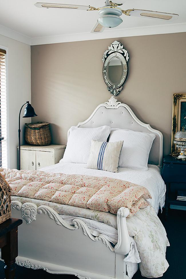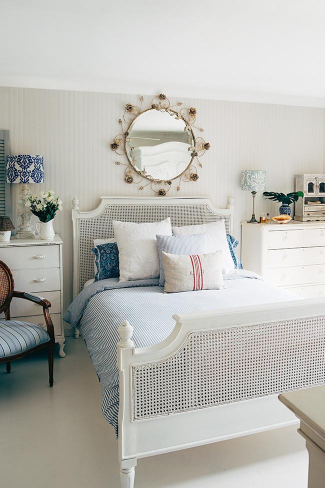 La habitación de invitados tiene como pieza principal una cama también recuperada en tono blanco y retapizada y sobre ella un espejo de estilo veneciano. Estos espejos nunca pasab de moda son un clásico que si lo sabes combinar bien siempre te dará mucho juego.