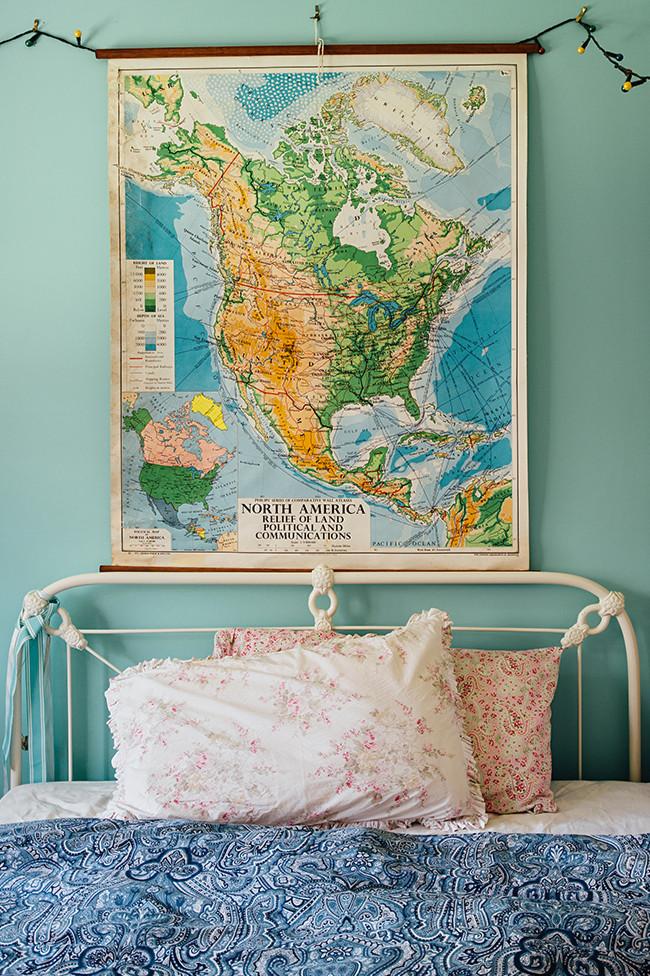 La habitación de la pequeña de la casa esta presidida por un mapa antiguo. Una tendencia que vemos hace tiempo esto de los mapas en cualquier decoracion y en cualquier espacio y que sigue absolutamente vigente.El cabecero de cama se ha renovado dando un tono blanco empolvado que queda estupendo con ese gondo turquesa de la pared.
