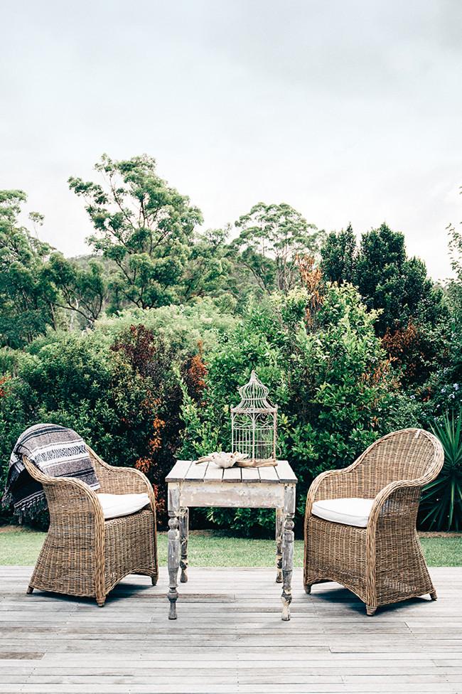 Y para finalizar el recorrido nos vamos al exterior de la casa con estos dos sillones de fibra y una mesa preciosa desconchones incluidos a la que se pudo la tapa pero respetando su aire rústico para ello se utilizaron listones de madera. Y el conjunto quedo perfecto para pasar horas contemplando el verdor que circunda la vivienda, sin más.Por lo menos eso es lo que yo haría que buena falta me hace.