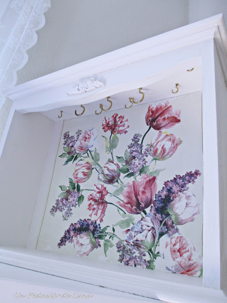 Le di unas manitos de pintura blanca, una linda servilleta como fondo y le apliqué unos ganchos a modo de colgadores y una plaquita de escayola para el acabado final !!