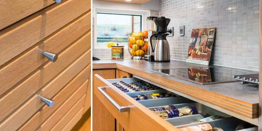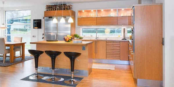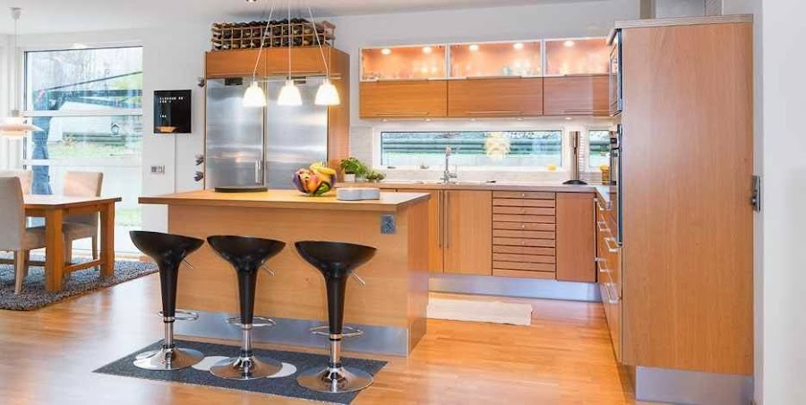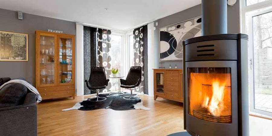El suelo de parket de roble une los tres ambientes. De roble también son los muebles de la cocina, la isla así como la mesa, la vitrina y el aparador del salón, con lo que ya tenemos otro nexo de unión. Para romper la monotonía de la madera, se ha jugado con negros y grises presentes en paredes, cojines, cortinas ...La gran chimenea, visible desde todos los puntos tiene la particularidad de poder girarse 180 grados, según las necesidades del momento. En definitiva es un luminoso y acogedor espacio, en el que se ha cuidado cada detalle para lograr una integración perfecta.