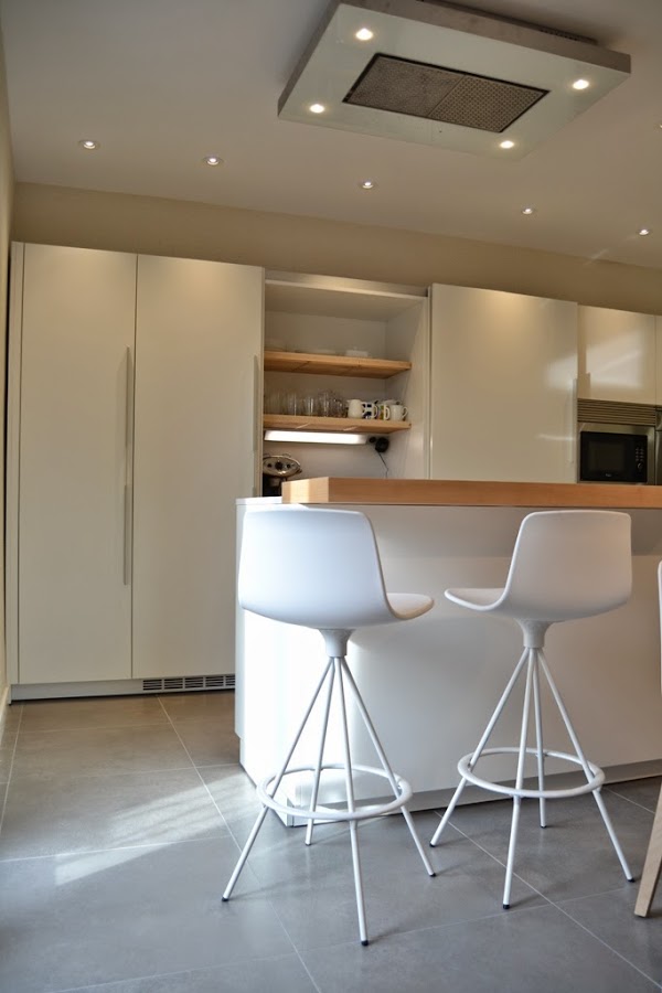 La distribución de ésta cocina tiene, como elemento principal, una isla con todo lo que hace falta, zona de lavado, de cocción, espacio de almacenamiento, zona de trabajo y preparación y hasta una barra para comidas informales. Un diseño limpio y sin estorbos visuales gracias a la campana de techo Gutmann, colores claros en toda la estancia y una iluminación apropiada, en el que juega un papel fundamental toda la zona de columnas ubicada en la pared posterior, donde se integran hornos, lavavajillas y frigorífico. Además, incluye un práctico armario con puertas de apertura coplanar, equipado con estantes de madera de haya y un pequeño espacio de trabajo con luz y enchufes especialmente colocados para poder usar los pequeños electrodomésticos.