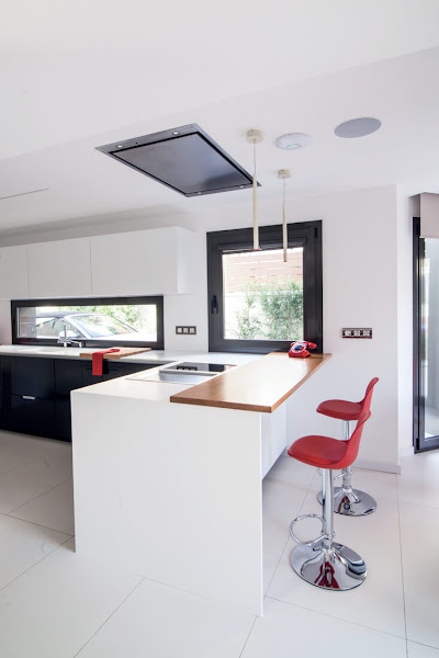 La campana Gutmann de techo garantiza una extracción eficiente y necesaria en espacios abiertos como éste y no representa un estorbo visual como lo podría ser cualquier modelo de isla en forma de T invertida.