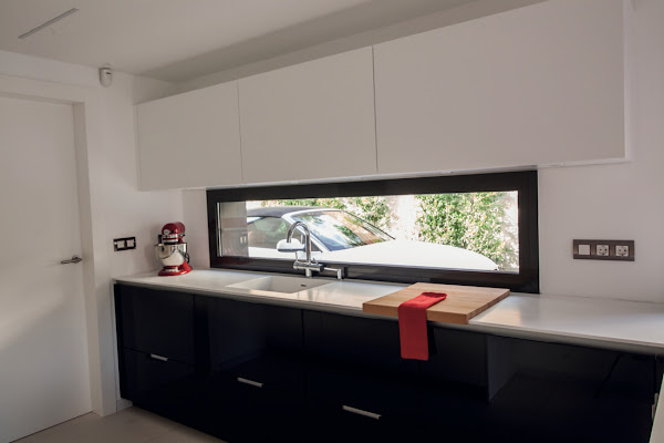 En la cocina de ésta vivienda reformada, se ha aprovechado toda la luz natural proveniente de ventanas y puertas, gracias a un diseño que la comunica con el office, pero que mantiene su privacidad con el comedor y salón debido al sistema de puertas correderas que los separa.