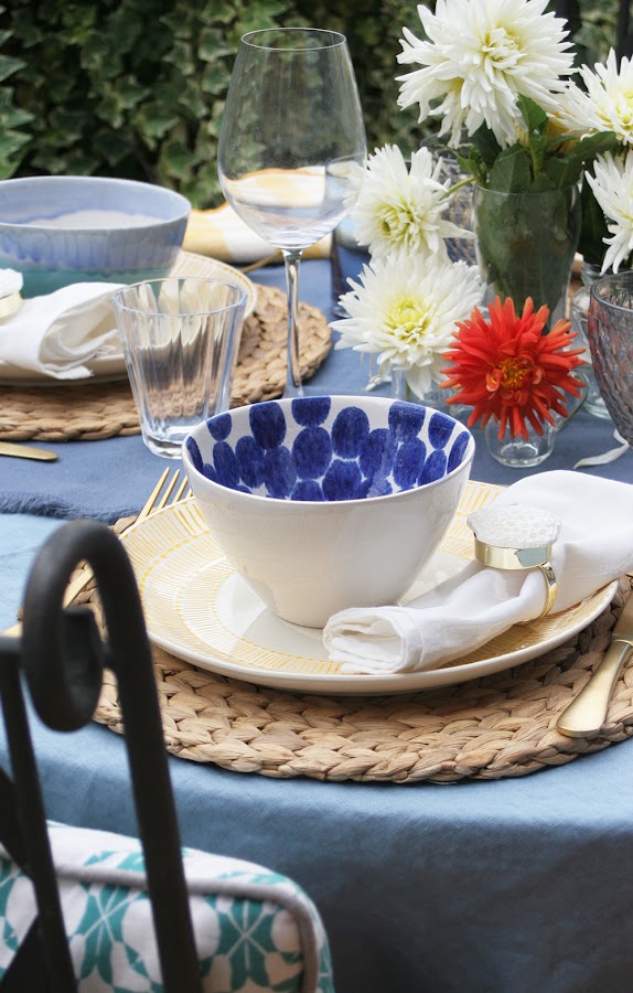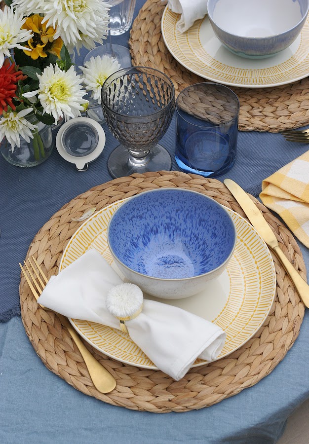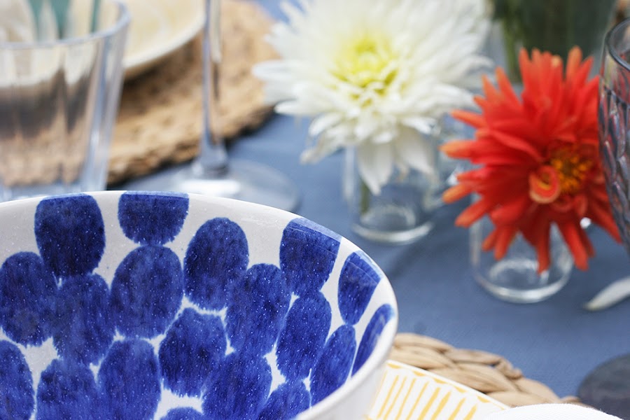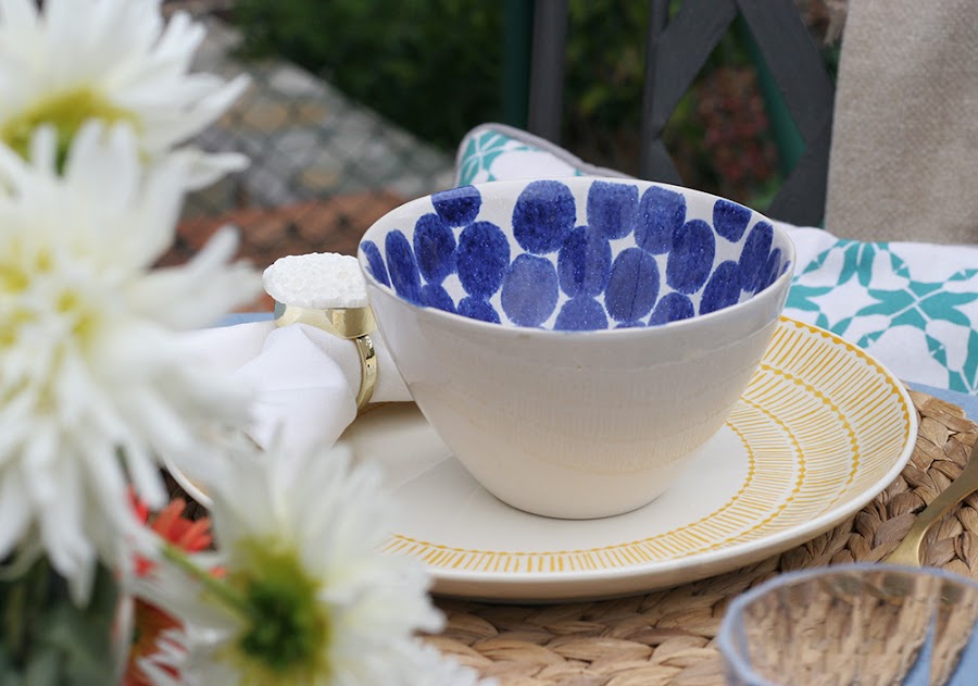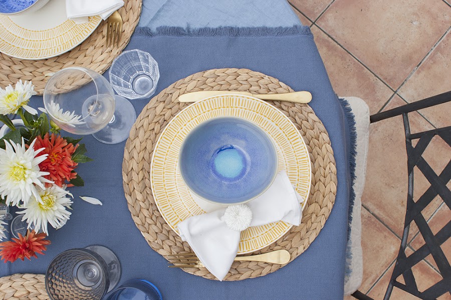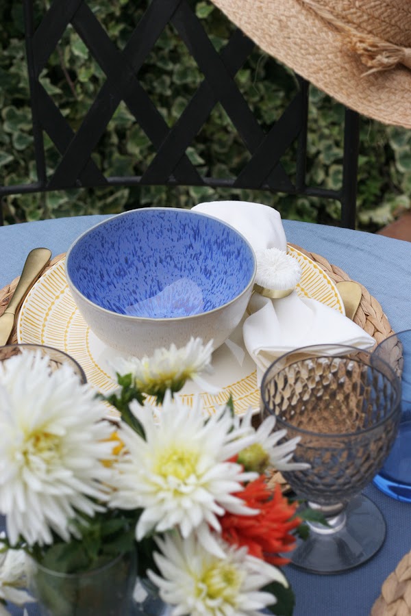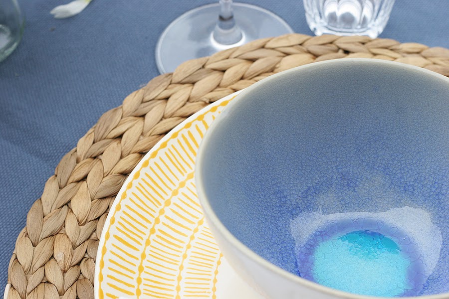 Elegimos cuencos en distintos tonos de azules, turquesas con distintos estampados, y plato llano con greca amarilla. Pero lo que realmente aporta el color, son las flores y los textiles ;)