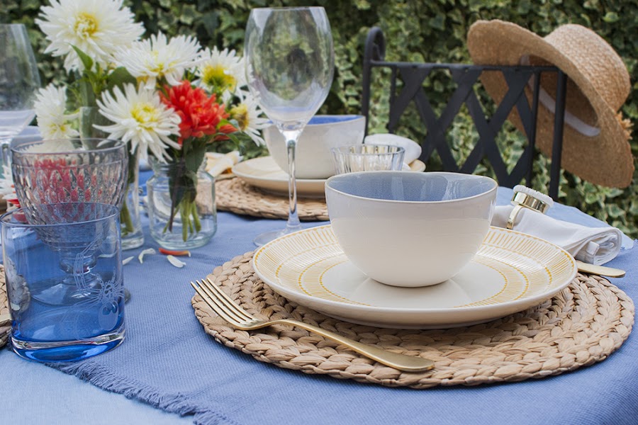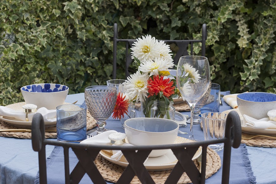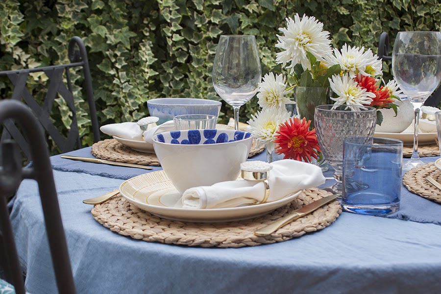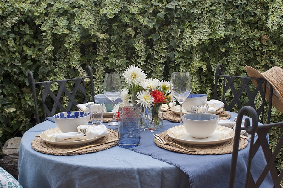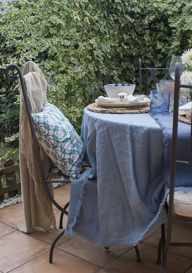 Es cierto que el día que hicimos las fotos estaba bastante nublado, y hubiéramos preferido los rayos dorados del atardecer bañando esta vajilla... pero aún así, nuestra pequeña terraza exterior cumple con nuestro objetivo.