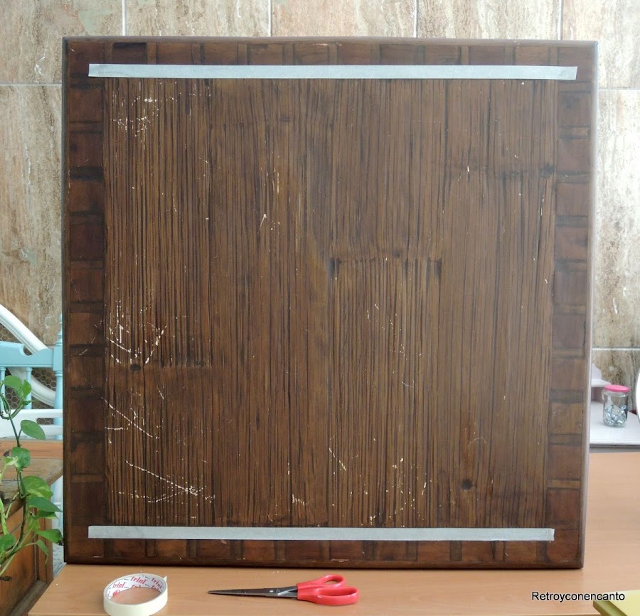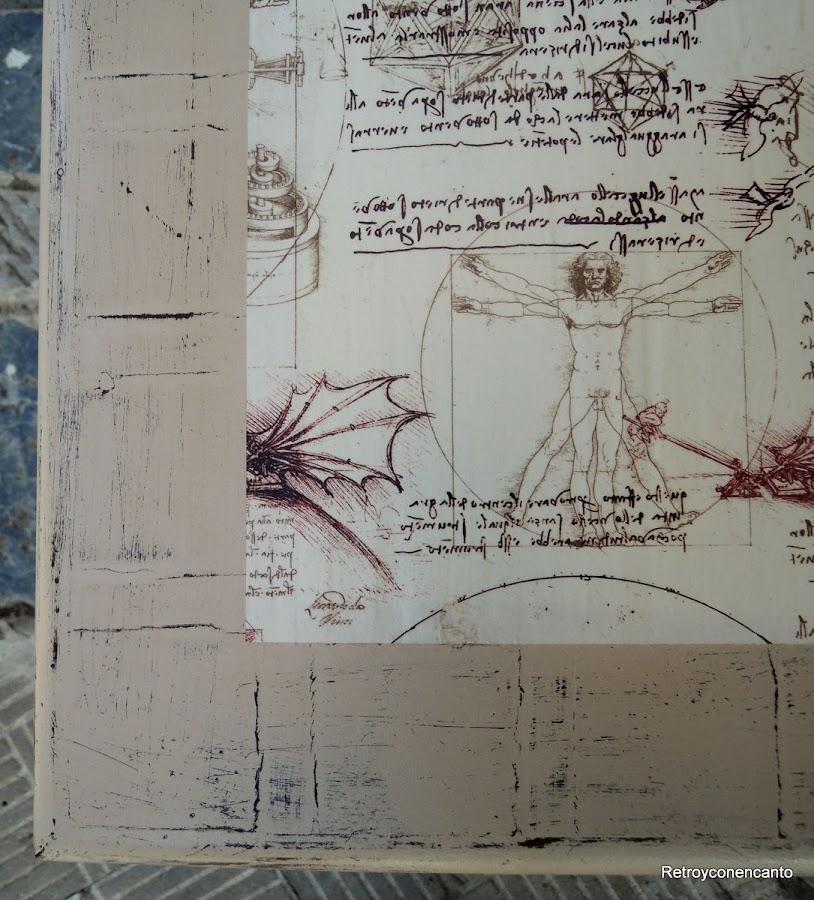 Cinta de carrocero para delimitar las zonas, y de nuevo recurrimos al Hombre de Vitrubio para un decoupage arriesgado en la parte central.