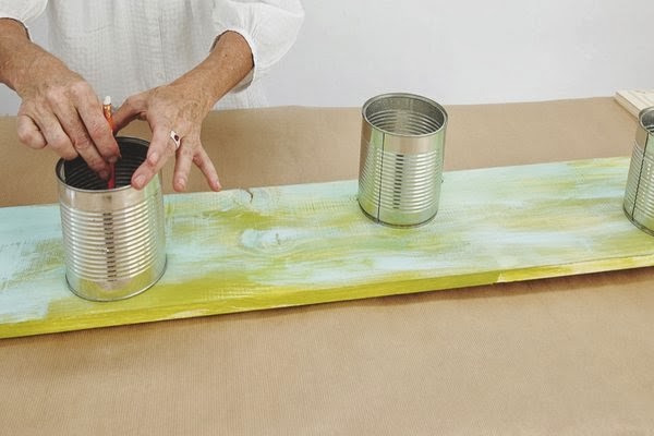 Una vez seco el tablero, distribuye las latas dejando la misma distancia entre una y otra. Con el taladro, haz un agujero del tamaño del tornillo en el fondo de cada lata. A través de ellos marca con lápiz en la tabla el lugar donde van a ir ubicadas.