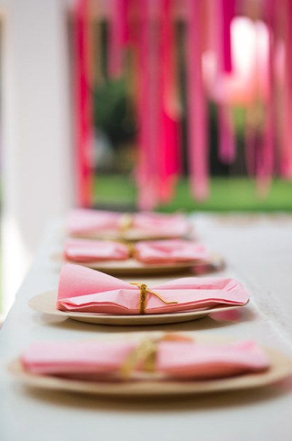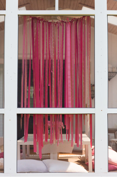 Bueno, bonito y barato sería el calificativo para esa cortina a base de cintas de raso que aporta color a toda la habitación y hace las veces de backdrop para la mesa.
