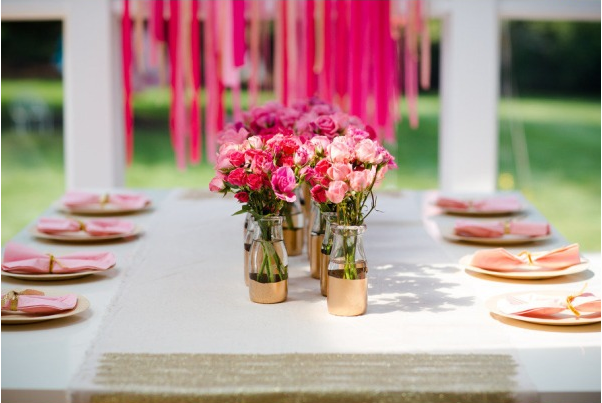 Es espectacular el efecto conseguido con ese buen montón de floreros hechos con tarros de cristal pintados y dispuestos a modo de camino de mesa. Ahora bien ... prepárate a dejar tu jardín "pelao" de flores.