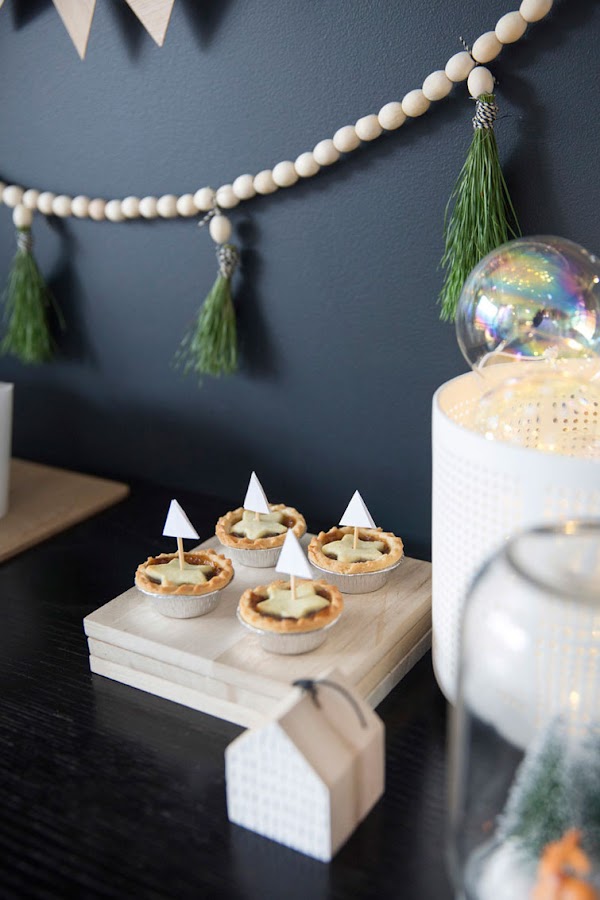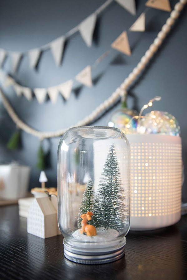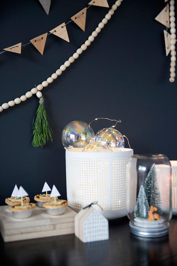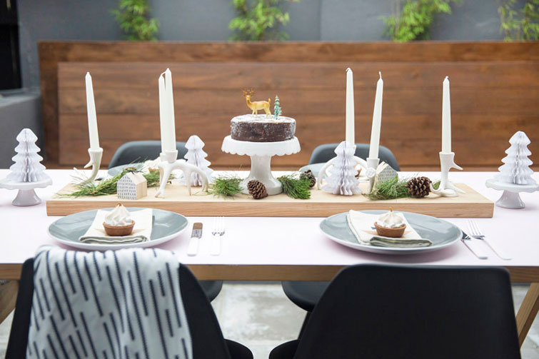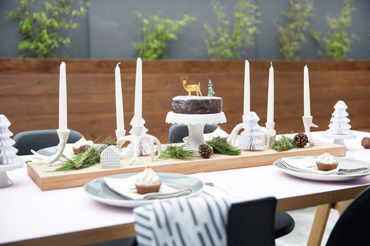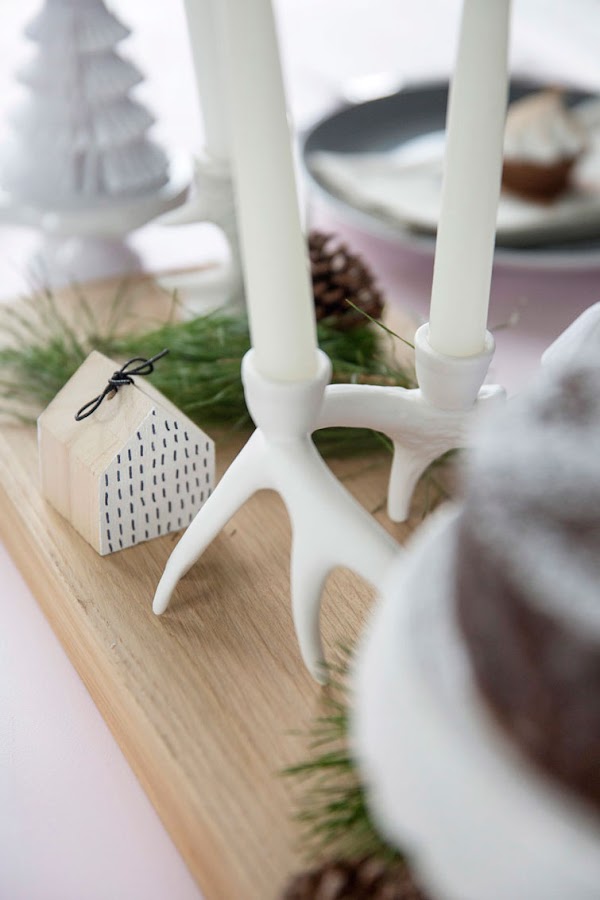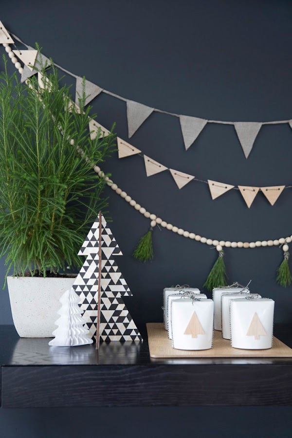 Renos, guirnaldas hechas a mano, bolsas de papel customizadas con etiquetas impresas, árboles tipo farolillo de papel y toque de verde que podemos encontrar seguro cerca de casa. Me encanta la base de la mesa, un simple de tablón de madera de pino. Creo que si fuera más antiguo, todavía quedaría con más encanto, y quizá (por ponerle otro pero) añadiría unas velas, que las echo de menos, o unas luces, que siempre le dan un toque diferente a todo.
