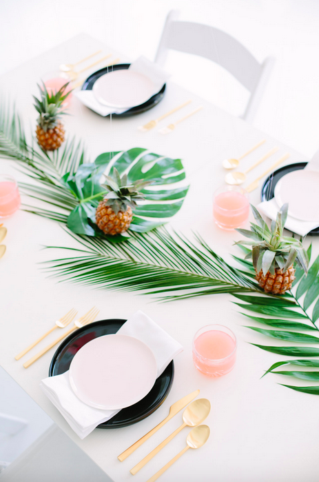 Seguro que nunca te hubieras imaginado este largo camino de mesa hecho con hojas de palmera, hojas de la costilla de adán y piñas naturales. ¿a qué no?.