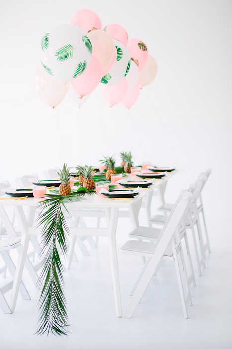 Rematando esta preciosa mesa, un centro de mesa aéreo con globos que van sujetos con hilo transparente a las piñas. ¡Qué bonito todo!.