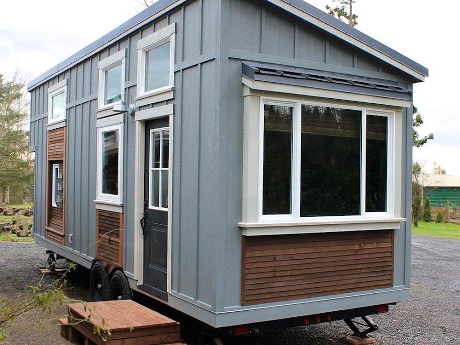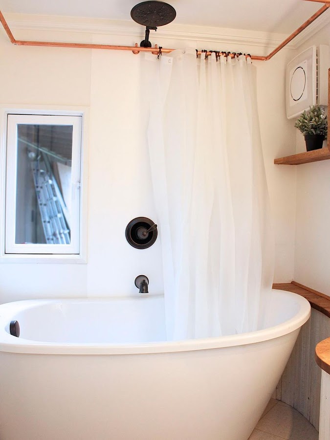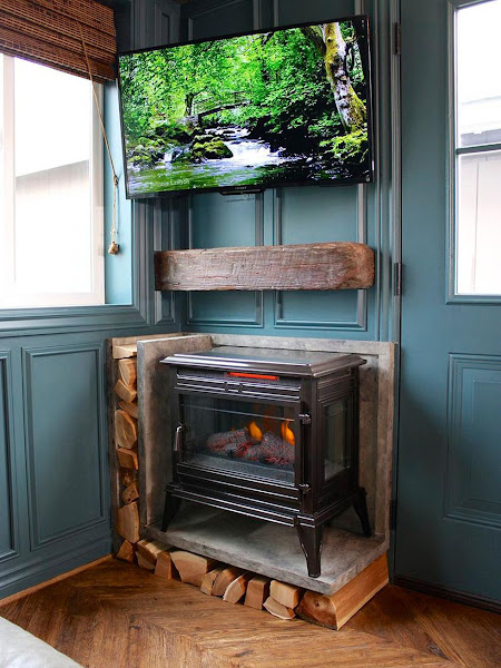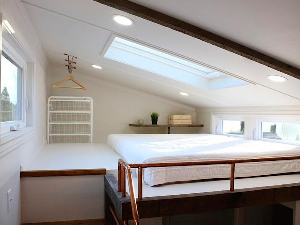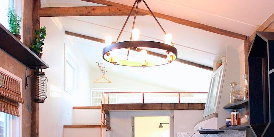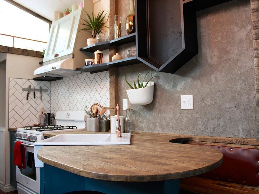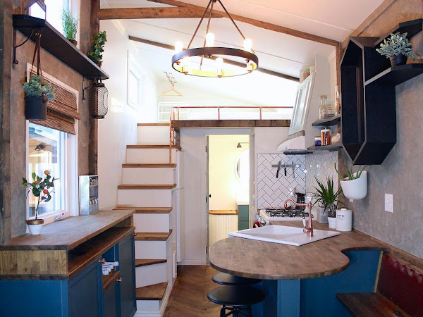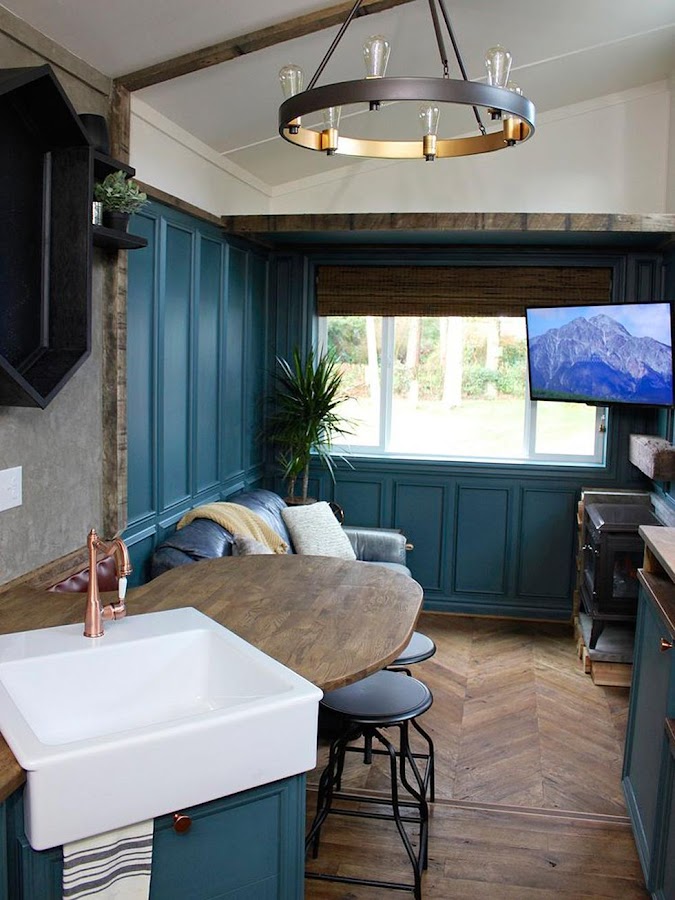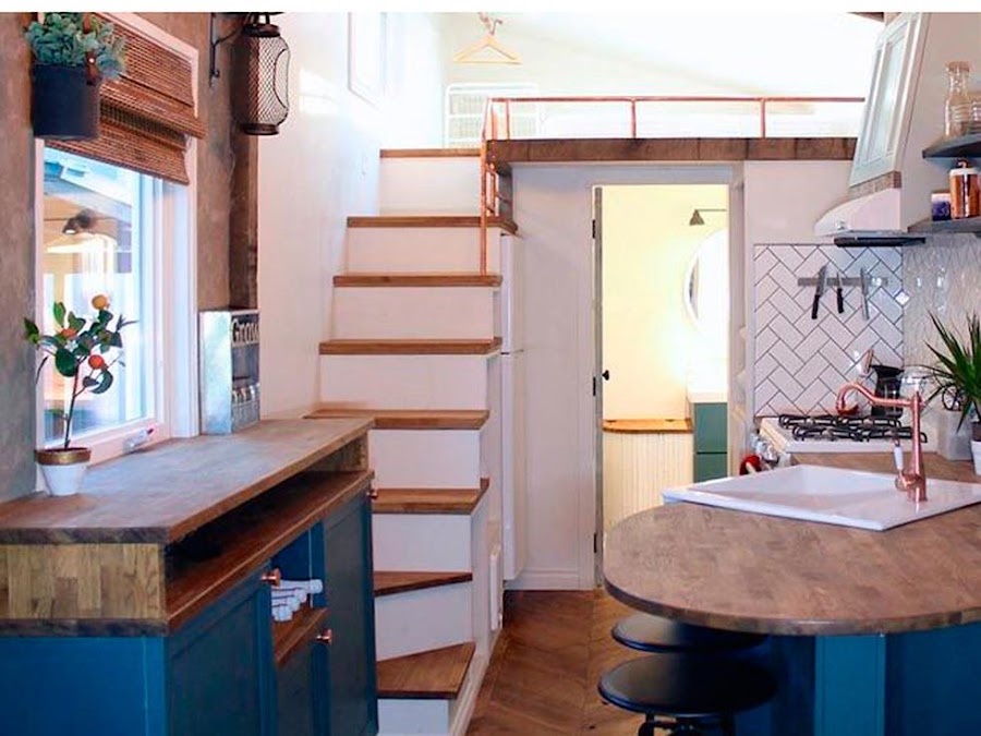 Cuenta además con algunas comodidades que no son propias de este estilo de minicasas. Hay una pequeña "barra de desayuno" curva en la encimera y una chimenea en la esquina debajo de la televisión.