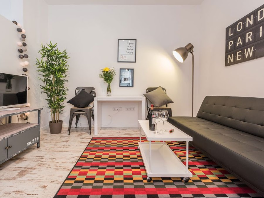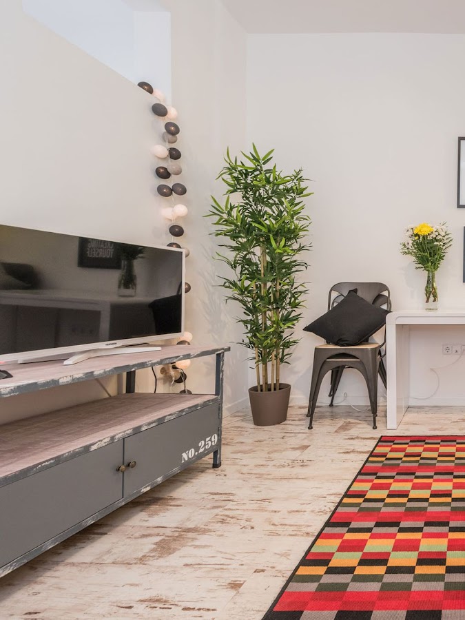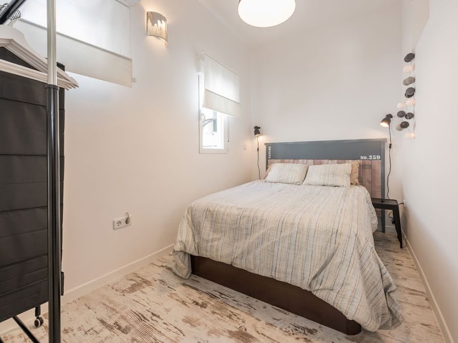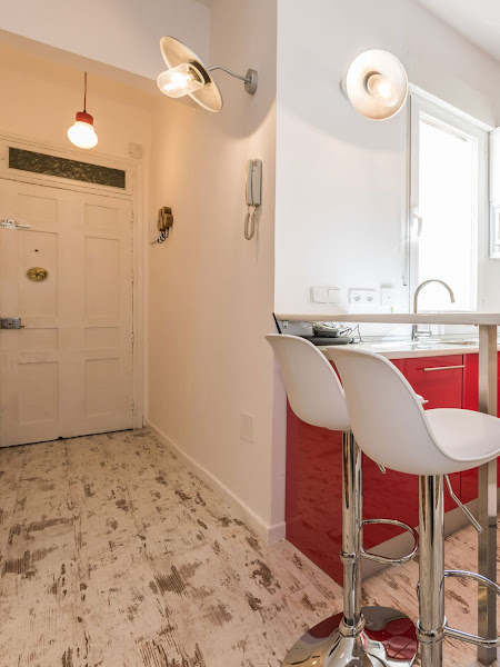 Los propietarios deseaban una vivienda visualmente amplia y luminosa, por esta razón se modificó por completo la nueva distribución. De los dos dormitorios, cocina, aseo y un pequeño salón iniciales, se pasó a salón y cocina con barra, dormitorio individual y cuarto de baño completo.