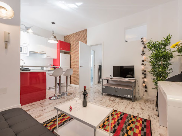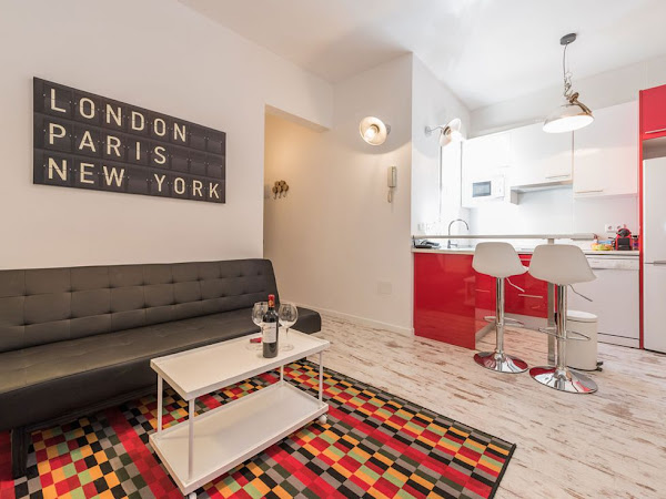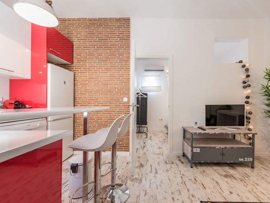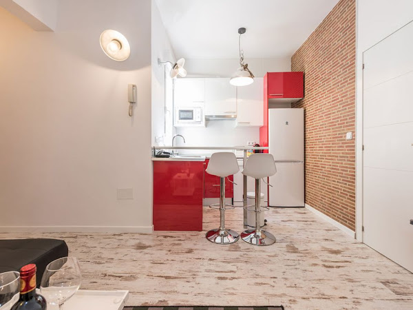 El salón se une con el comedor y la cocina, y todo ello se comunica además con el recibidor. En la cocina se ha escogido el rojo y el blanco para que encaje en el aire urbano de la zona común. Los revestimientos de ladrillo potencian además este estilo y se delimita el espacio con una barra de desayunos.