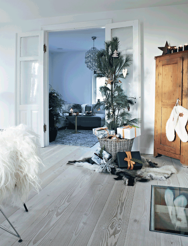 No he podido encontrar fotos del dormitorio, pero seguro que era fantástico, desde luego que los toques naturales ayudan muchísimo a conseguir un ambiente como este, pero me gusta especialmente que su esencia el nórdico quizás mas moderno y de líneas rectas se transforme en estas fechas en un hogar tan acogedor, por cierto hoy me quedo con el árbol natural y sus detalles en color teja.