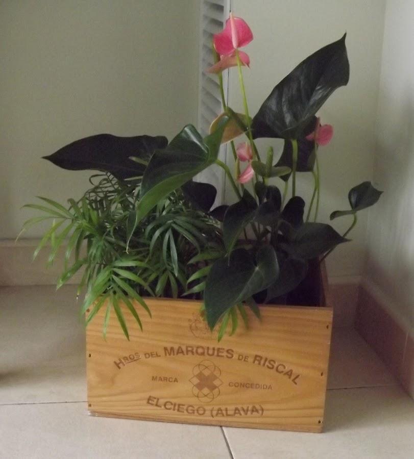 Este fin de semana he comprado varias plantas de interior...hiedra,espatifilos,anthurium y una palmera.Solo con un poco de imaginación podeis alegrar cualquier rincón de la casa.Una caja de vinos,en ella he puesto la palmera y el anthurium...y en un pequeño mazetero de la firma Sia los espatifilos y la hiedra. Con todo ello he dado una nota de color a la cocina y a un rincón del piso superior.Solo hay que preocuparse de agruparlas de especies parecidas para que el riego y la luz sean semejantes.¡Animaros y dejad volar vuestra imaginación...