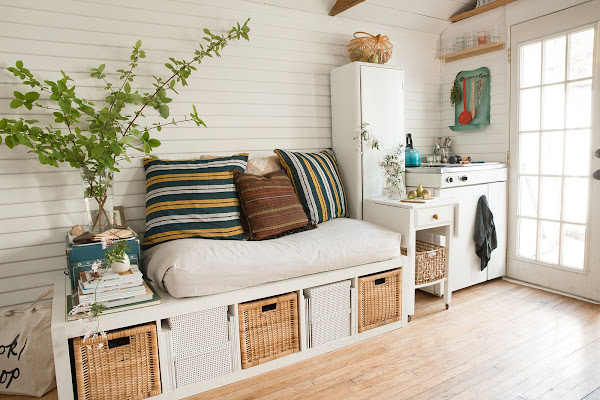 Pero bueno, he escogido esta casa por lo bonita que es y por el ingenio que han tenido a la hora de solucionar los problemas que surgen por la falta de espacio.Decorar espacios pequeños exigen mucha planificación y darle vueltas a la cabeza para conseguir espacios definidos usando muebles que sean bastantes multifuncionales. De este tipo de muebles podemos ver varios ejemplos en esta mini casa, por ejemplo el sofá hecho con una estantería Expedit de Ikea para poder ganar espacio de almacenamiento, o la mesa plegable que a su vez es un pequeño aparador. Una ventaja muy buena de esta mini casa es que cuenta con un pequeño patio, donde se puede hacer mucha vida diario disfrutando del sol y del buen tiempo. Como detalle de este patio, ¿os habéis fijado en la guirnalda de luces? La semana pasada vimos mucha inspiración para colocar guirnaldas de luces en el exterior y este es otro ejemplo muy bueno para la lista.