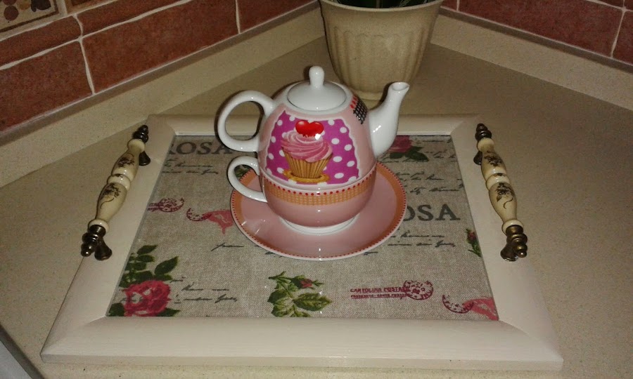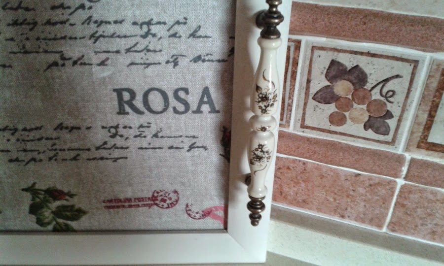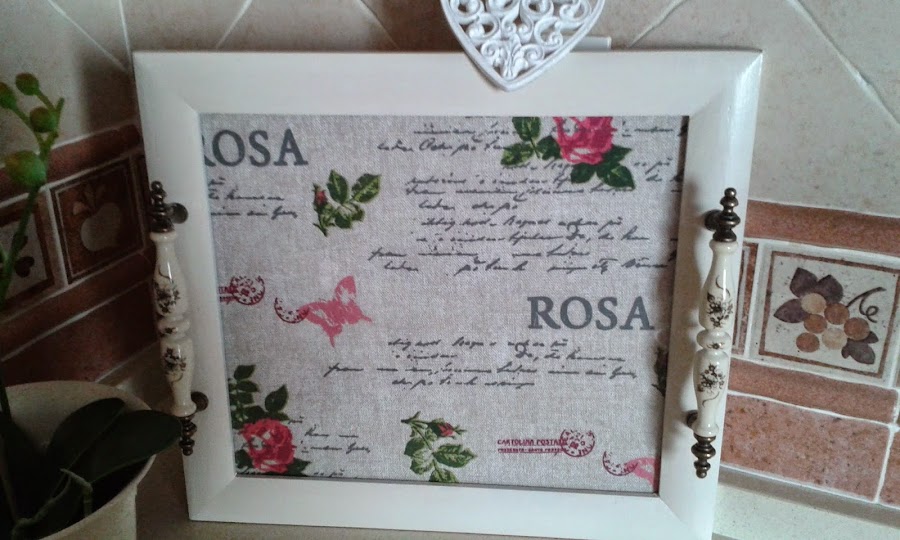 Pinte el marco en el color arena y coloque unos bonitos tiradores, una telita y listo ya tengo mi coqueta bandeja