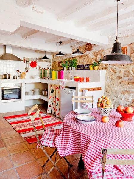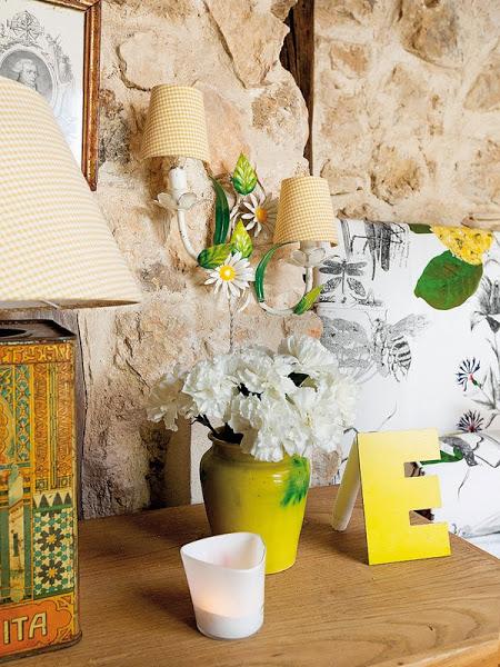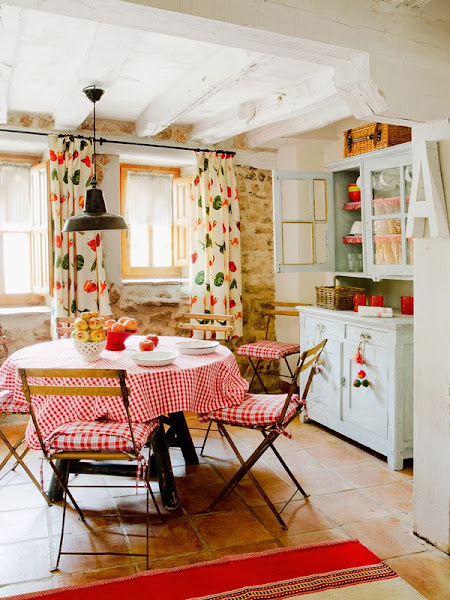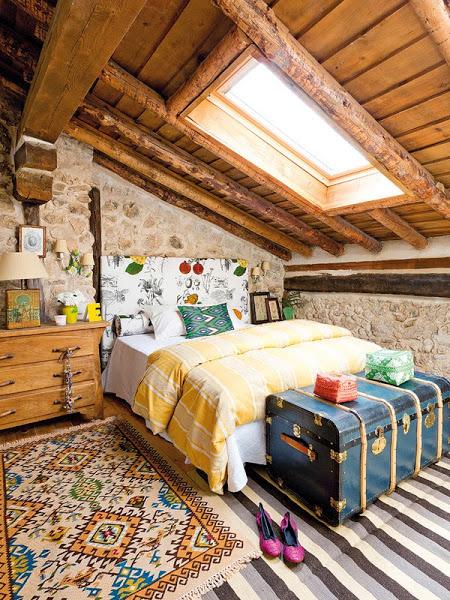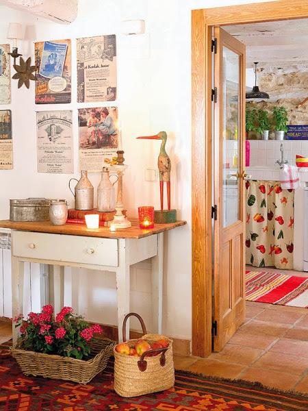 En toda la casa destaca el estilo rústico renovado, con el toque tradicional de los materiales naturales como protagonistas, y sin olvidar los complementos llenos de vitalidad y color, los estampados llamativos y ciertas piezas aisladas de aire retro. Una base en blanco como color predominante hace que las pinceladas cálidas, tan necesarias a la hora de combatir los fríos inviernos de la zona, se creen gracias a los sólidos muebles de madera, a las numerosas alfombras que cubren el pavimento, a los almohadones y, cómo no, a las mantas de punto grueso y pelo largo. Las alfombras superpuestas y la llamativa mezcla de estampados y colores en los textiles completan ese aire desenfadado.