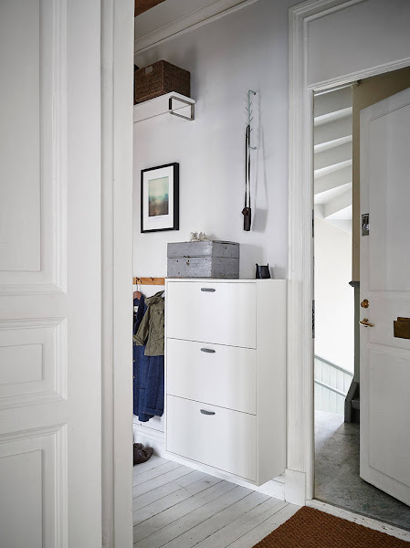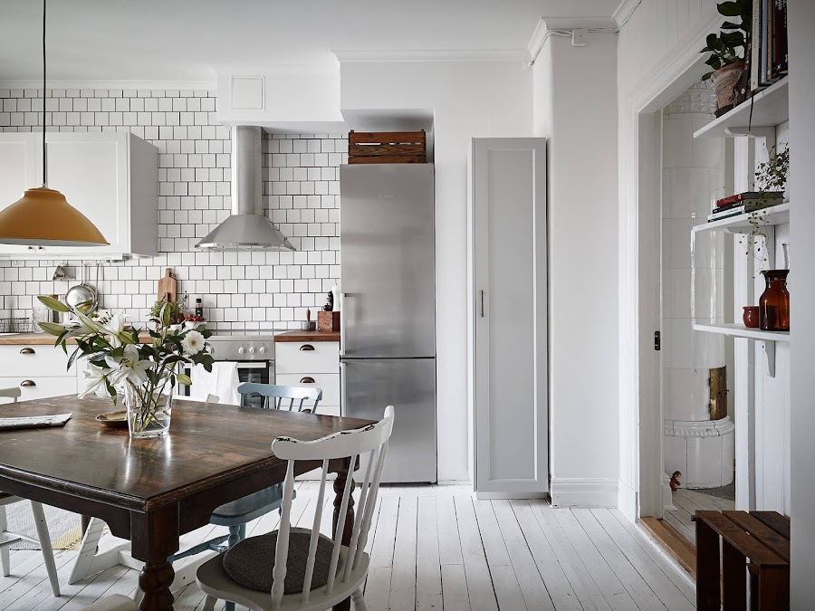 Como puedes ver por las imágenes de esta vivienda, el salón está presidido por una bonita estufa de cerámica que si te digo la verdad, me he quedado prendada de ella, vamos que ya la quisiera yo para mi casa, aunque no sé dónde la iba a poner. Y justamente, esta estufa es una de las cosas que se han aprovechado, y con acierto, tras la reforma. La sala de estar y gracias a sus grandes ventanales, se ha convertido en un espacio inundado de luz natural. El suelo de madera es otra de las cosas que se ha respetado en esta reforma y lo único que se le ha hecho, ha sido tratarlo con aceite de cera pigmentada.