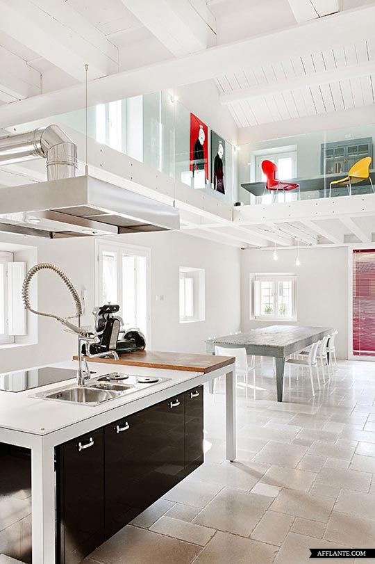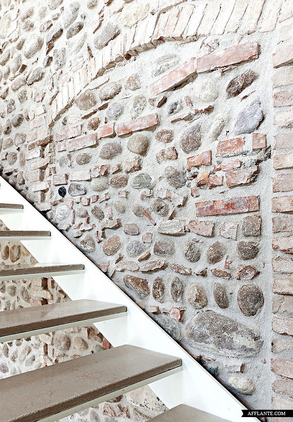Una antigua villa italiana totalmente renovada de la que solo se conservan las paredes y los elementos arquitectónicos. Paredes de piedra y vigas de madera de estilo rústico conviven con muebles modernos, elementos metálicos y objetos de diseño, en perfecta armonía.