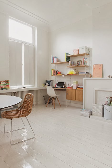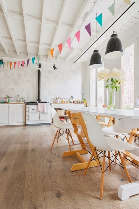 La vivienda se encuentra en el centro de la ciudad belga de Gante, el detalle de la guirnalda de banderines en el espacio que comparten cocina y comedor me ha parecido muy divertido que aporta un punto de color al techo de madera pintado de blanco. Toda la vivienda está llena de este tipo de detalles, toques de color en elementos decorativos y textiles para aportar ese extra de color a la base blanco y madera.
