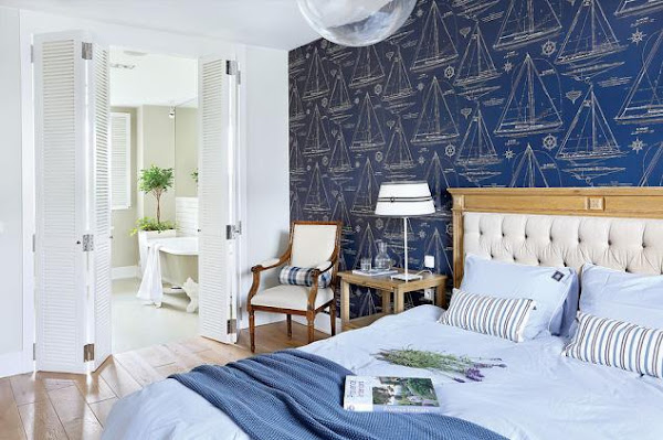 Me encanta su estilo mediterráneo tan elegante, con muebles que alternan la madera con el color blanco y los toques de azul que dan vida al conjunto. Pero lo que de verdad me parece todo un acierto es el estilo marinero que desprende esta vivienda, el papel pintado con barcos de habitación principal, los remos en la pared de la terraza cerrada o el vinilo de la rosa de los vientos en el cristal de salida a la terraza. Os dejo con ella, porque pienso que lo mejor es que la veáis por vosotros mismos.