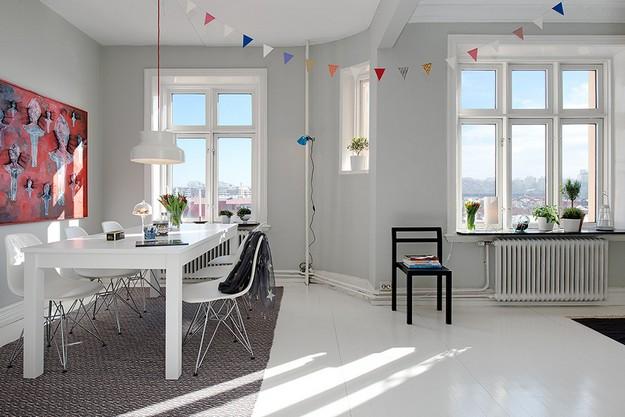 Se trata de una hermosa vivienda distribuida en 104 metros cuadrados en Suecia, y que consigue potenciar aun mas los metros con el color, con su magnifica altura y la unión de espacios con paso de puertas de dimensiones mas exageradas.