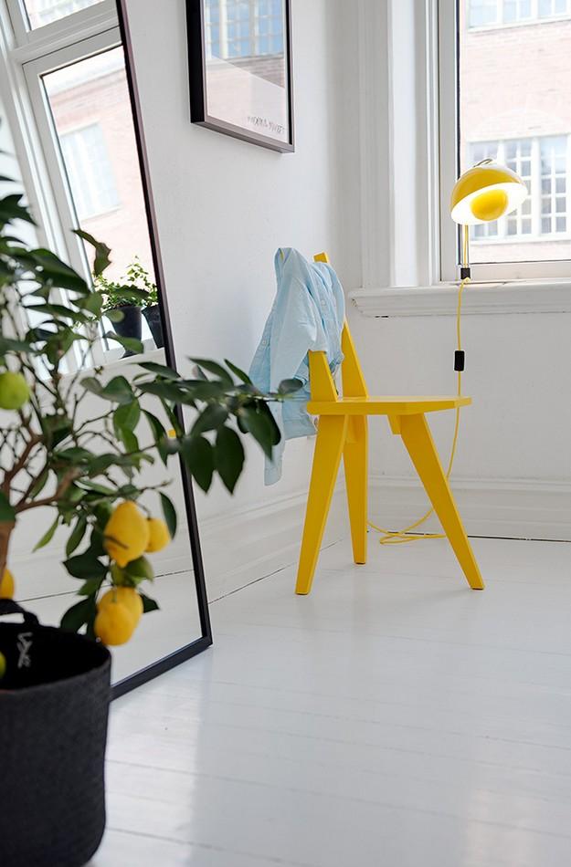 No puede ser mas ideal la forma con la que deciden compaginar ciertos detalles de color, una lampara, una silla y ese espejo inclinado que no hace mas que potenciar aun mas el espacio.
