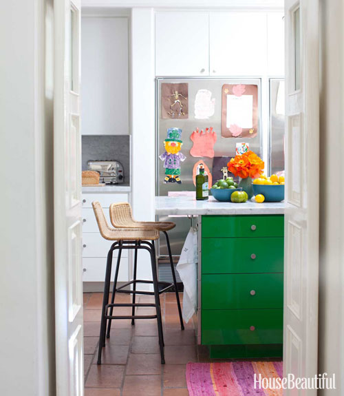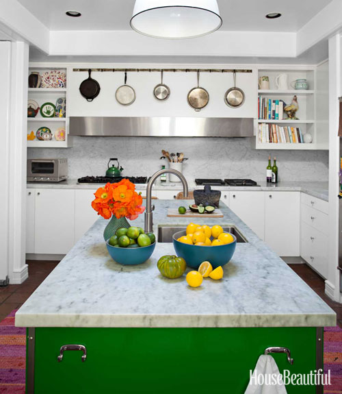 La sala de estar juega con la base neutra en paredes y techos, pero interoduce el color en textiles y decoración, así como la cocina, en la que se ha destacado la isla central pintándola en color verde.