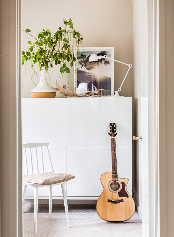 Y este rincón con el mueble metálico de Ikea y el adorno de ramas en la pared, me parece precioso!