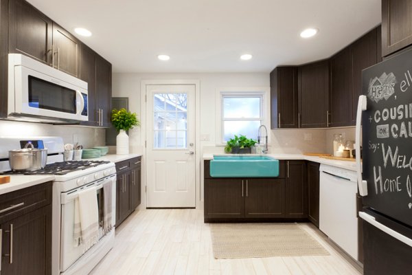 Y que me decís de la cocina? Me parece de lo más original la nevera revestida de pintura de pizarra para poder anotar todo sin problema y el contraste de la madera oscura del mobiliario con el gran fregadero en color turquesa.