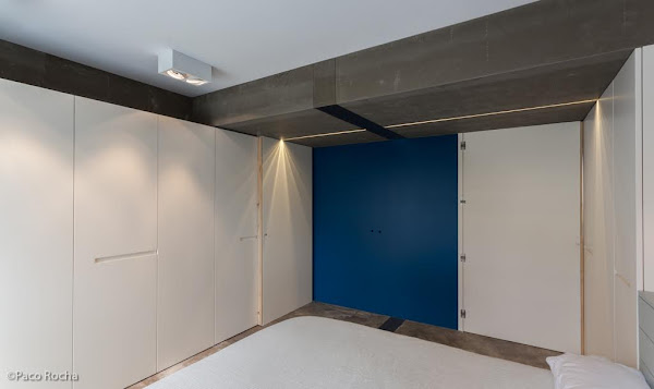 El largo del pasillo se ha aprovechado para colocar una gran fila de armario semi ocultos. Pero no todas estas puertas son armarios, detrás se la última, se esconde la habitación del peque de la familia.
