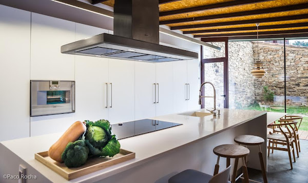 En esta foto se ve como han combinado la estética antigua de la vivienda con la ampliación para la cocina, me encanta la mezcla de estilos, ¿lo que dicho ya?...