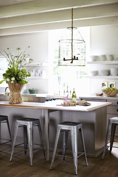La cocina con una gran isla perfecta para disfrutar de buenas velas entre amigos, baldas voladizas para organizar todo el menaje y la lampara hecha con un cesto de metal, me ha encantado. Las puertas rusticas hechas con madera vieja.