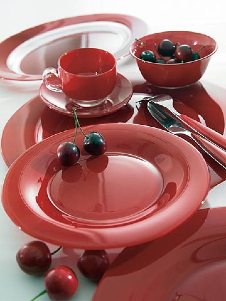 Pero la ligereza visual también se alcanza por medio de materiales transparentes. La línea original de Colorplaytime muestra una vajilla de gran intensidad cromática. Cinco expresiones de un mismo sentimiento: verde lima, rojo apasionado, amarillo ácido, rosa fuerte y azulón. Las tazas de café están disponibles en más colores.