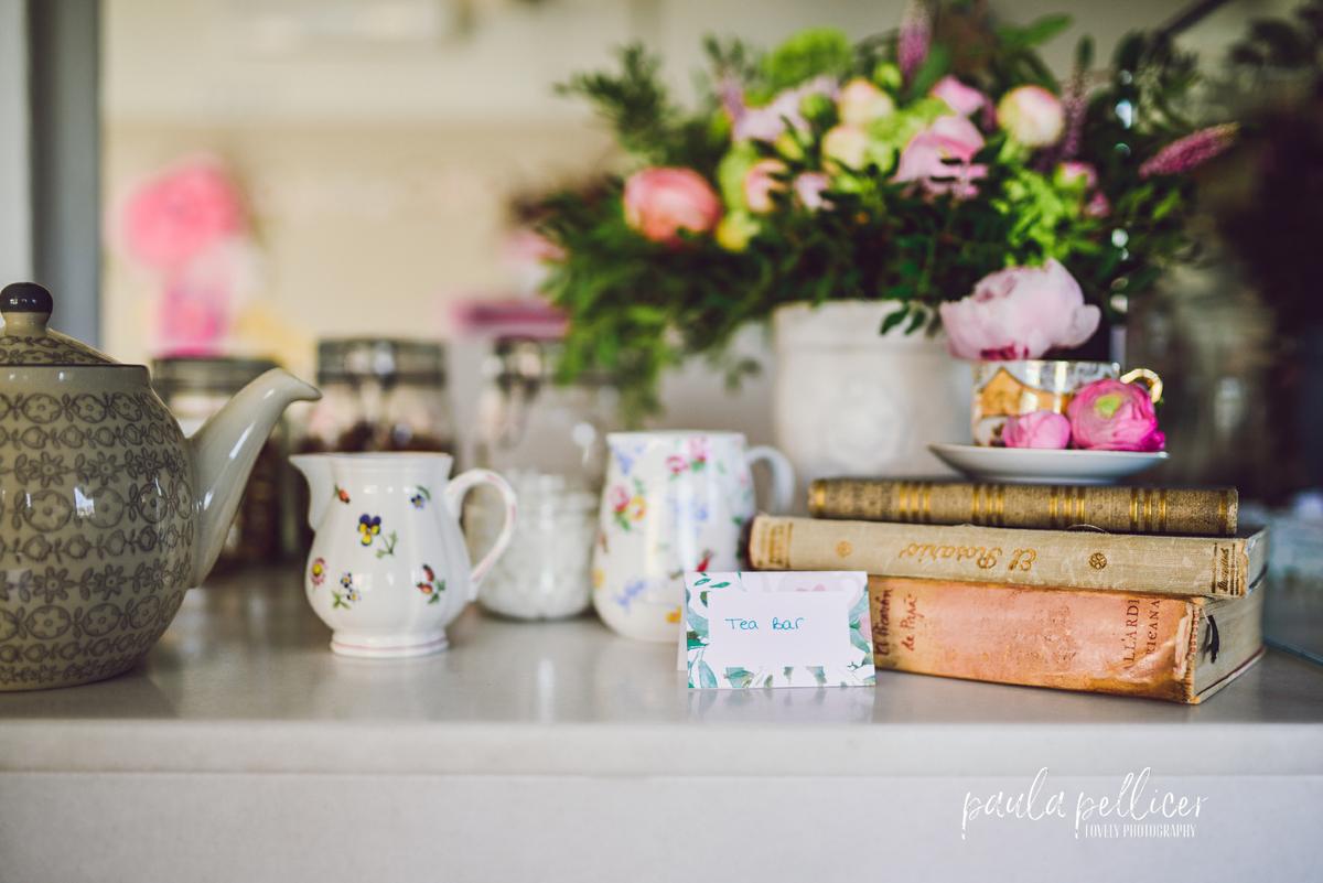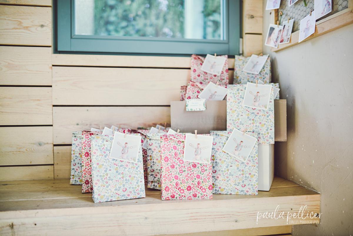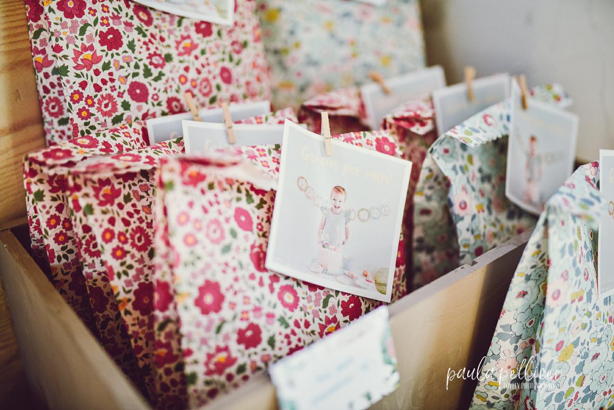 Debajo, dejamos las bolsitas con los detalles para los invitados. Muchas me habéis preguntado qué pusimos allí. Pues bien, como se trataba de una fiesta de té, hicimos una “kit para enamorarTE”. Con unas bolsitas Liberty de Hascot Kids, pusimos un set desechable de plato y taza precioso, una bolsita de te y una galleta que yo misma hice con forma de bolsita de te. Me vais a matar pero no tengo fotos del interior, así que pediré a algún invitado que me lo presté o lo recrearé yo misma y os lo colgaré en instagram. Para cerrarla usamos una foto de Paper Lover que había editado con la app de Typic un “muchas gracias por venir” y cogido con una pancita de madera. Ideal, ¿verdad?