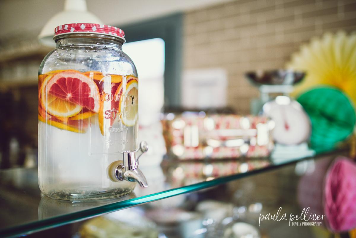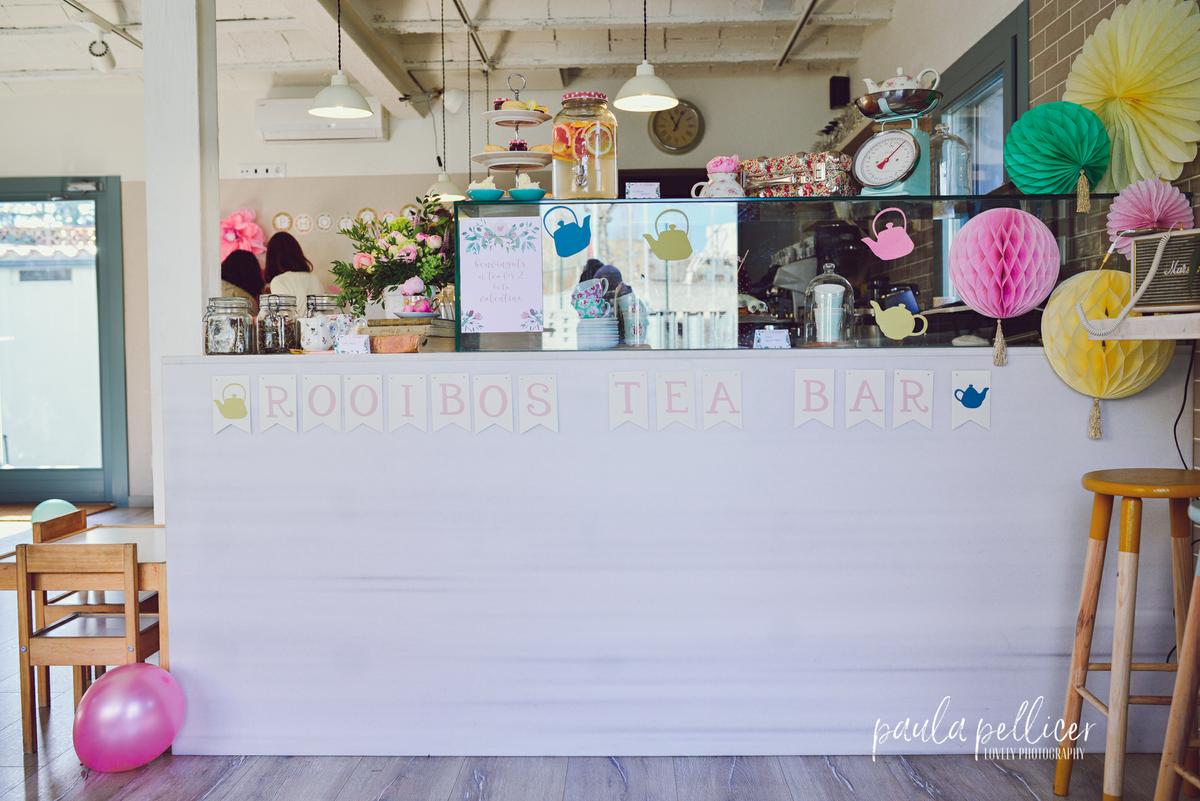 Nada más entrar, nuestros invitados se encontraban con este súper rooibos bar. Un surtido de tes espaciados, y ellos mismos se podían servir a su gusto y hacerse su infusión. En el aparador de la cafetería aprovechamos para poner algunas tazas de atrezzo, uno de los pasteles de zanahoria (con un tope de cartulina de Estudi Vint-i-dos), una torre con scones y un dipensador con agua refrescada con pomelo y naranjas. La guirnalda de Rooibos Tea la hicieron handmade Hip hip Hurray.