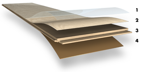 La capa 1 o superior está compuesta por una capa realizada a base de resinas, que le proporciona la dureza y la resistencia ante las manchas, ante el desgaste del uso, los impactos e incluso a las quemaduras o la humedad.