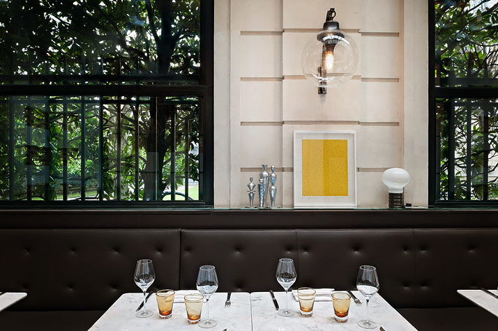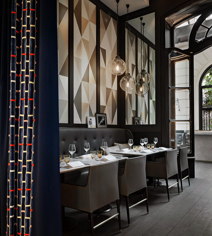 Ubicado en una mansión del siglo XIX en 7 Rond-point des Champs-Élysées, en la famosa casa de subastas parisina del mismo nombre. Su interior hace referencia a grandes nombres del diseño del siglo XX, como Gio Ponti y Ettore Sottsass, combinando tonos beige, marrón y negro, con madera oscura, telas y grandes ventanales clásicos.