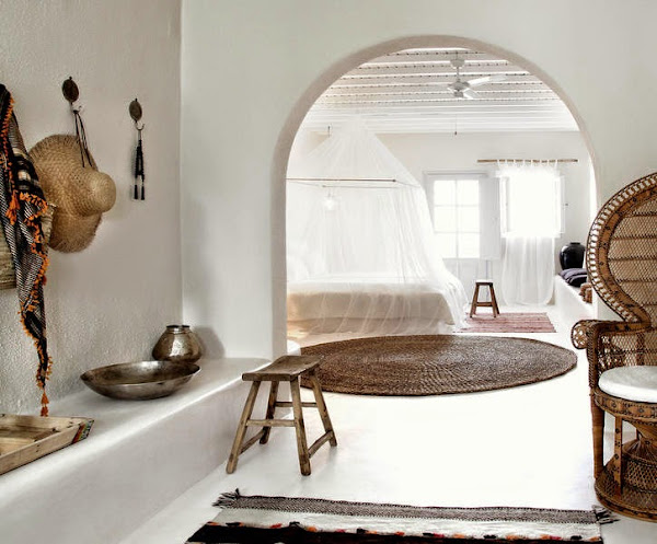 Hoy recuperamos la sección viajar para trasladarnos a este exclusivo hotel en Mikonos. El hotel San Giorgio es un lugar especial, su diseño muy mediterráneo como las casas tradicionales de esta pequeña isla Griega con paredes blancas y techos planos. Su interior pretende ser un espacio "calmado", decorado con muebles y accesorios naturales como la madera o el ratán y elementos boho como los doseles de las camas y otros de estilo morocco como los faroles o candelabros, las alfombras y otros textiles. Un conjunto que hace de este lugar un hotel hecho a medida para personas que buscan la desconexión de la rutina del día a día y pasar unas vacaciones únicas.