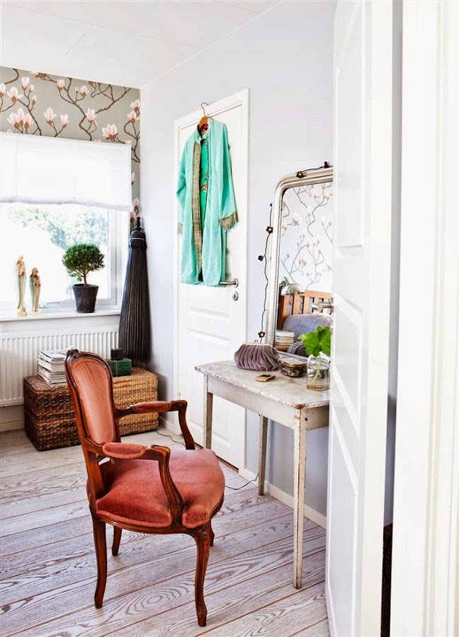 Suelos en roble lacado mate en las habitaciones. En la pared, papel pintado magnolia hace el dormitorio mas cálido. La mesa de maquillaje y la silla han sido adquiridos en mercado de pulgas.