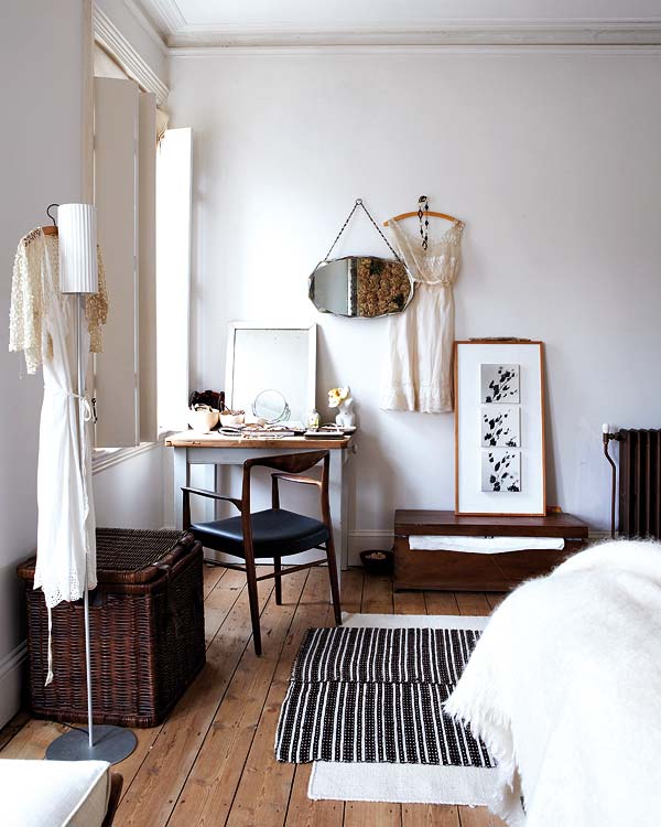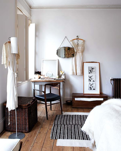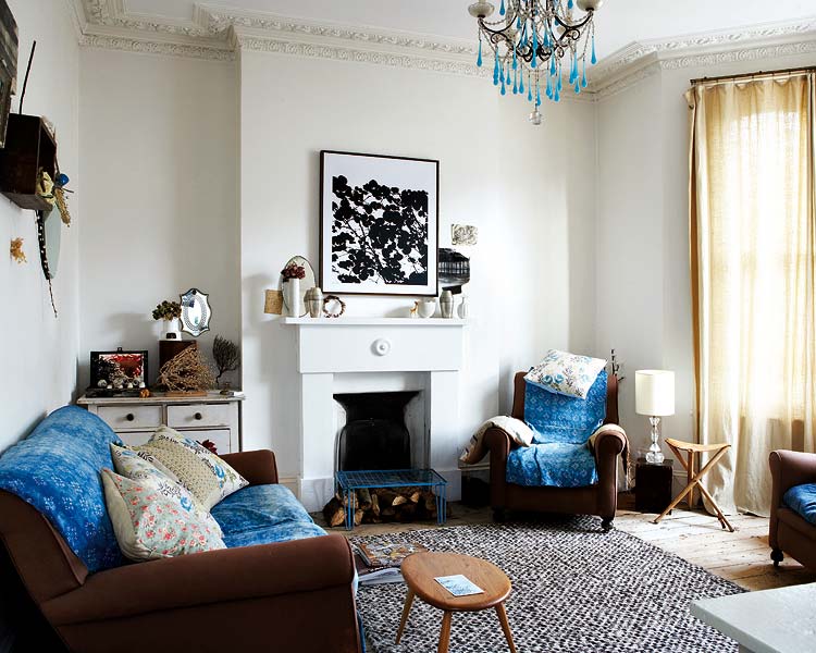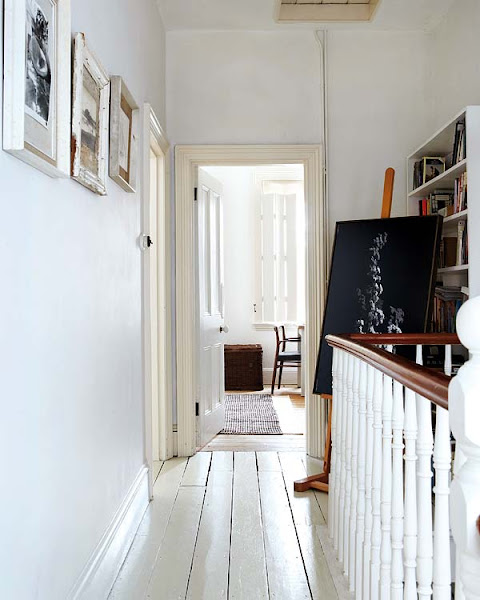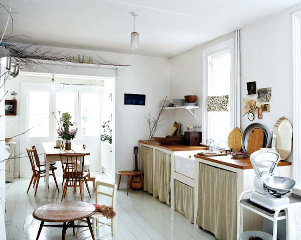 Estantes para colocar la vajilla de diario Combinación de telas, texturas y estilos Cojines hechos por la propietaria con telas vintage Recibidor con las típicas baldosas de origen marroquí Una gran pizarra da la bienvenida a la parte superior de la casa